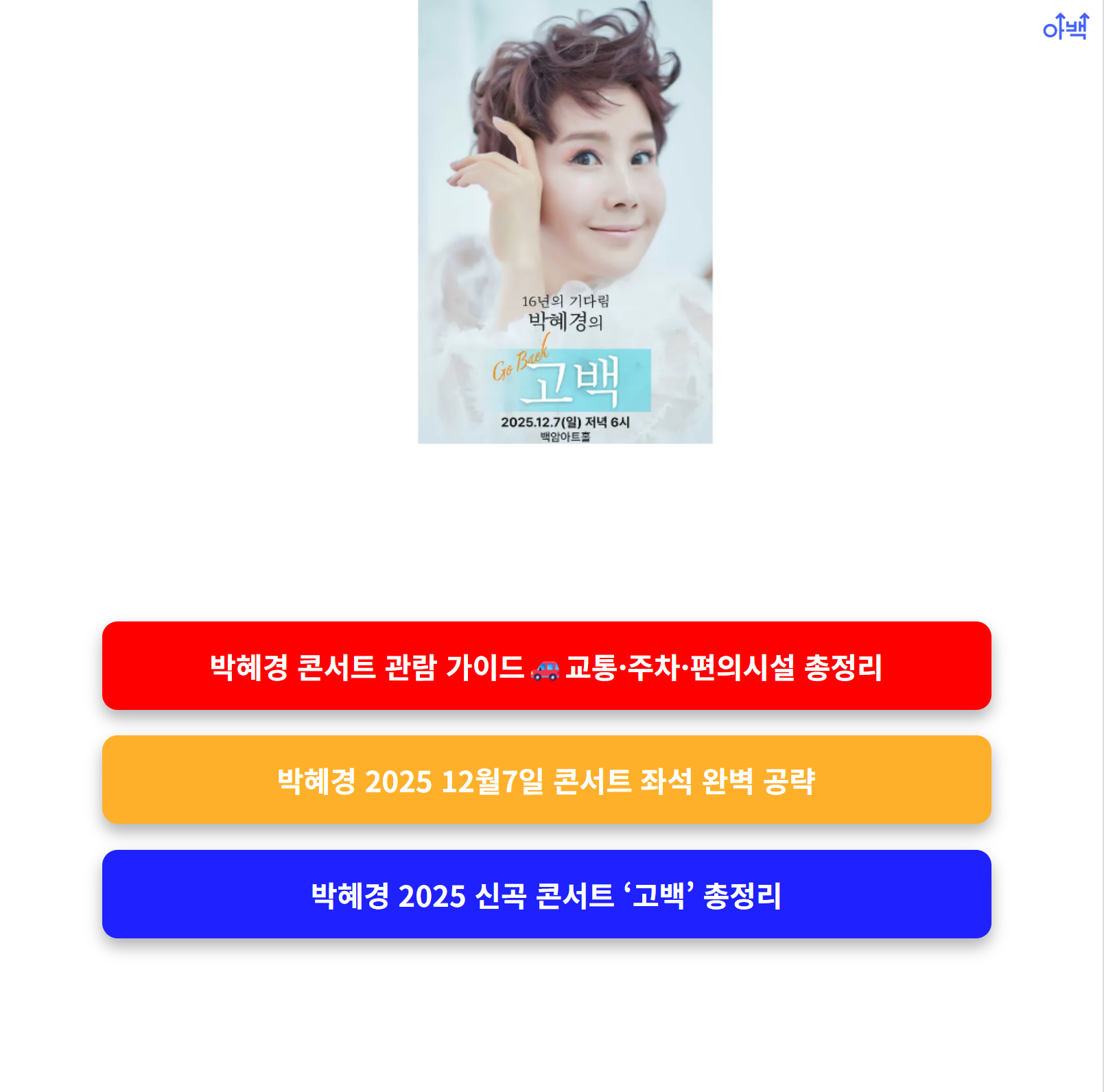 기다림 끝에 돌아온 박혜경의 단독 콘서트 '고백(Go Baek)'! 오는 2025년 12월 7일 단 하루, 백암아트홀에서 열리는 이 감동의 무대를 더욱 완벽하게 즐기기 위해선 교통, 주차, 편의시설까지 꼼꼼히 알아야 합니다. 공연 당일, 불편함 없이 박혜경의 감성을 온전히 만끽할 수 있도록 지금부터 꿀팁을 모두 정리해드립니다.